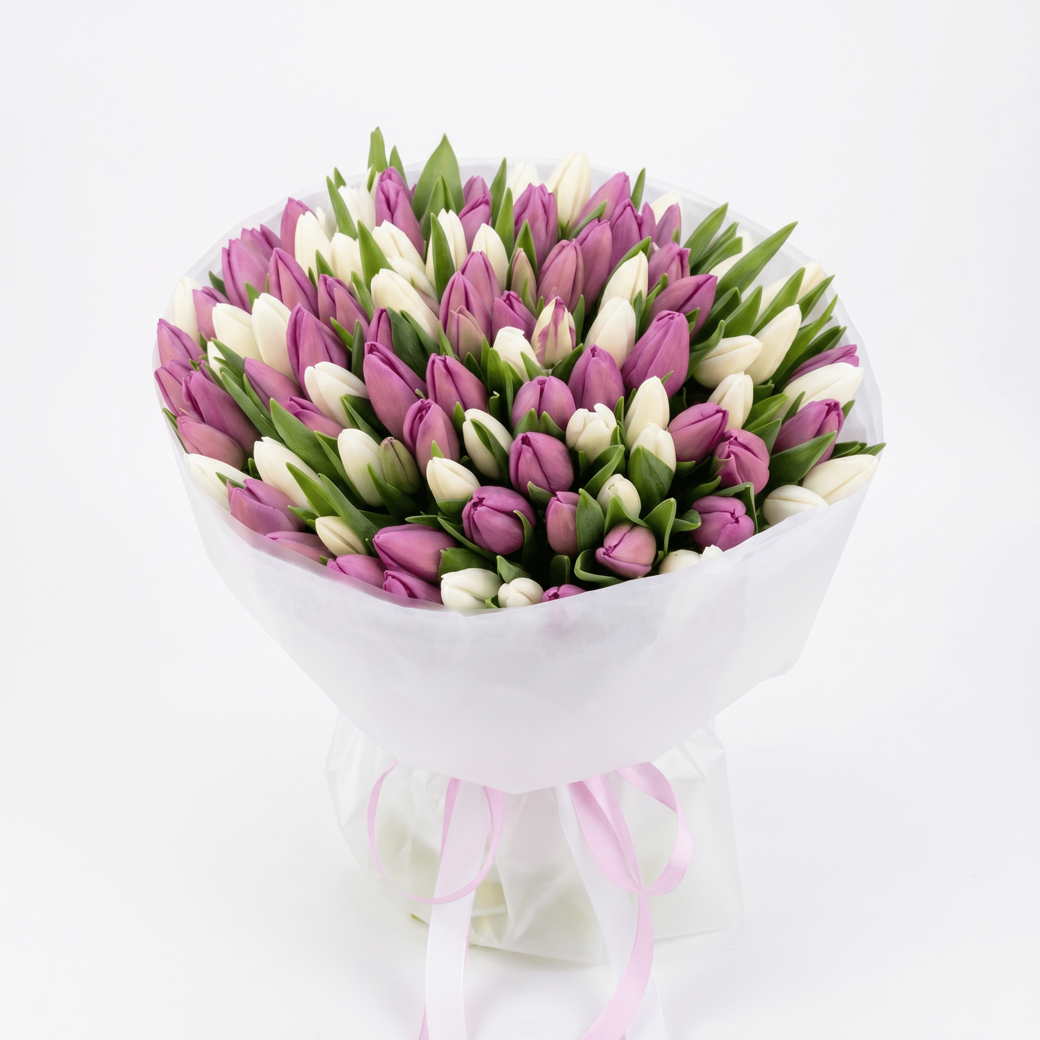 Bukiet “Biało-Fioletowe Tulipany” to bukiet z białych i fioletowych tulipanów owinięta w dekoracyjny papier i przywiązana wstążką. Na zdjęciu prezentowany jest bukiet z 101 tulipanów. Do każdego bukietu zostanie dodana torba na kwiaty, aquabox oraz odżywka do kwiatów. Dzięki temu Państwa bukiet wyglądać będzie bardziej efektownie, a kwiaty będą świeże przez długi czas.Należy pamiętać, że ze względu na sezonowość niektórych kwiatów i dodatków, bukiet może delikatnie różnić kształtem czy odcieniem kwiatów od prezentowanego na zdjęciu.