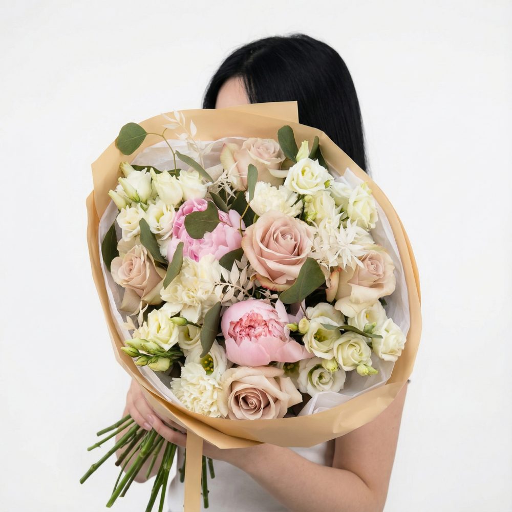 Delikatny jak poranny łyk ulubionej kawy, subtelny jak pierwsze promienie słońca – bukiet Carmel Latte to kompozycja stworzona z myślą o chwilach, które warto celebrować powoli. Pudrowe róże, biała eustoma, lekko zaróżowione piwonie i odrobina eukaliptusa tworzą zbalansowaną, pastelową harmonię z nutą ciepła i luksusu.