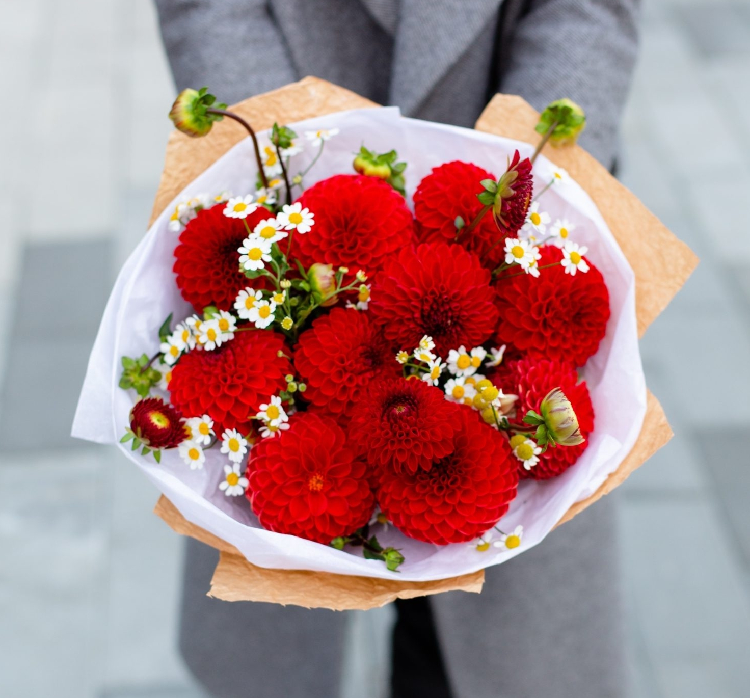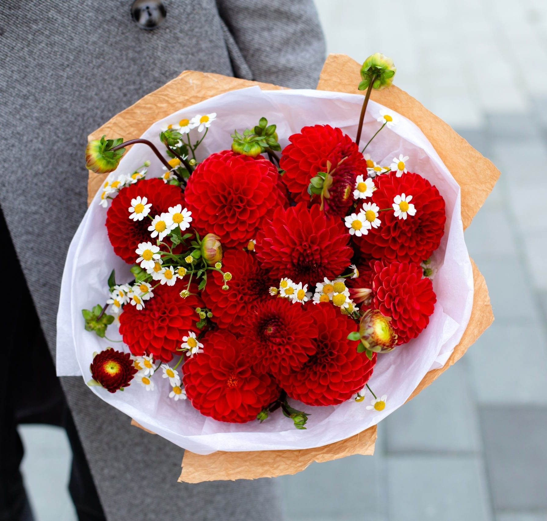 Skład bukietu: dalie, rumianek, papier dekoracyjny