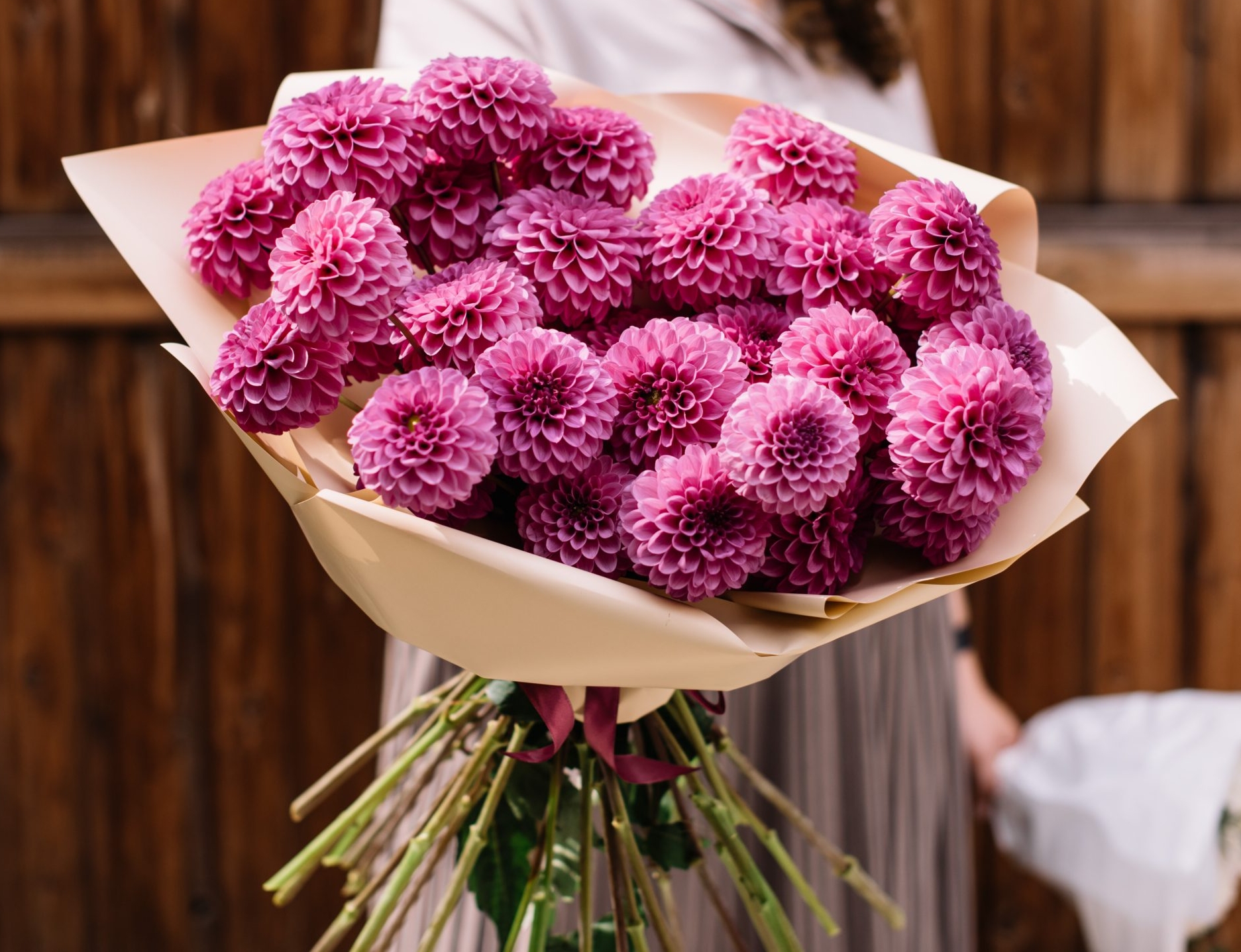 Skład bukietu: dalie, papier dekoracyjny