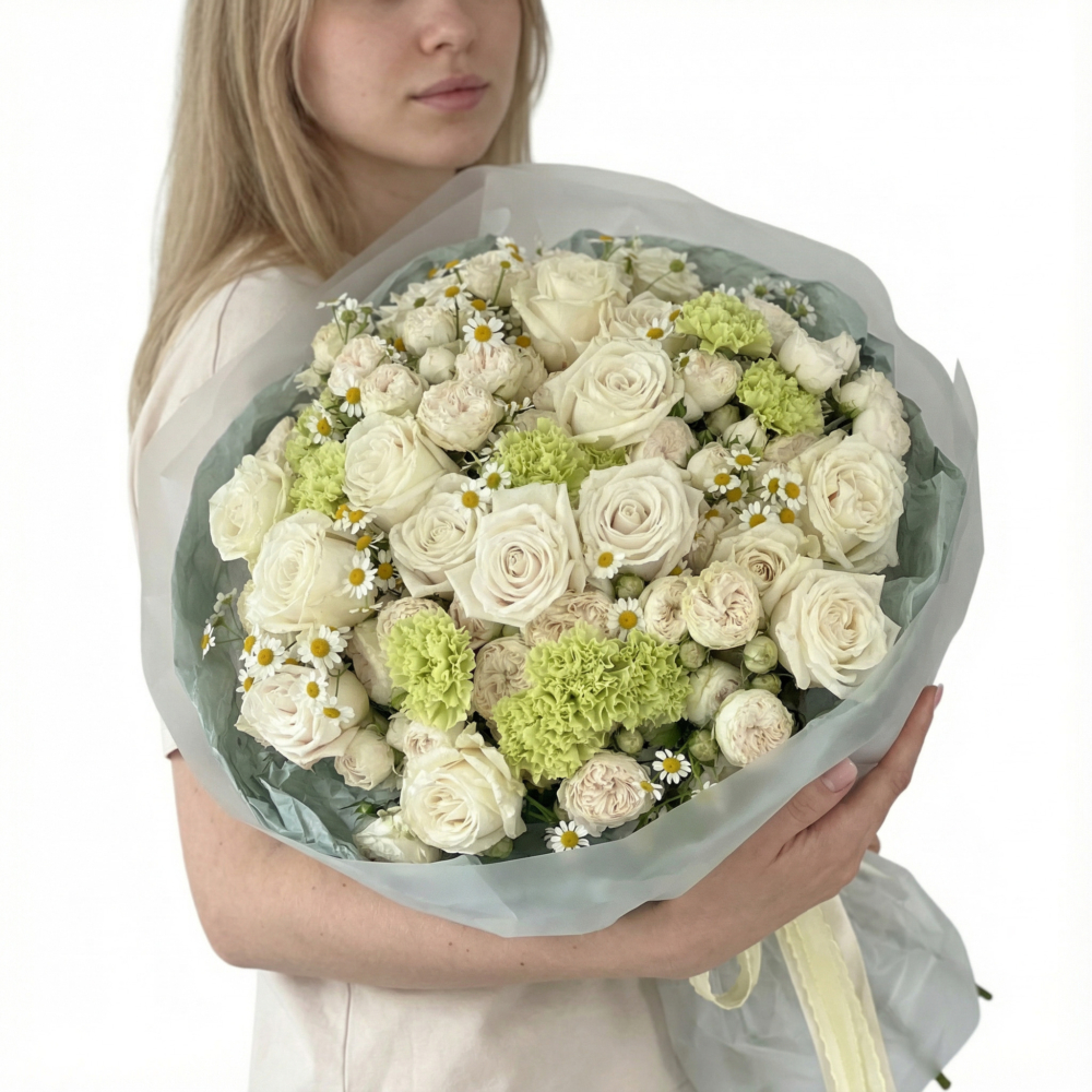Skład bukietu: róża, róża gałązkowa, goździk, rumianek, papier dekoracyjny