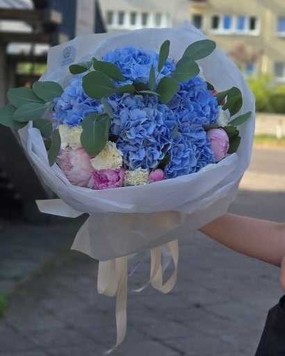 Skład bukietu: hortensja, peonia/róża, goździk, zielone dodatki, papier dekoracyjny