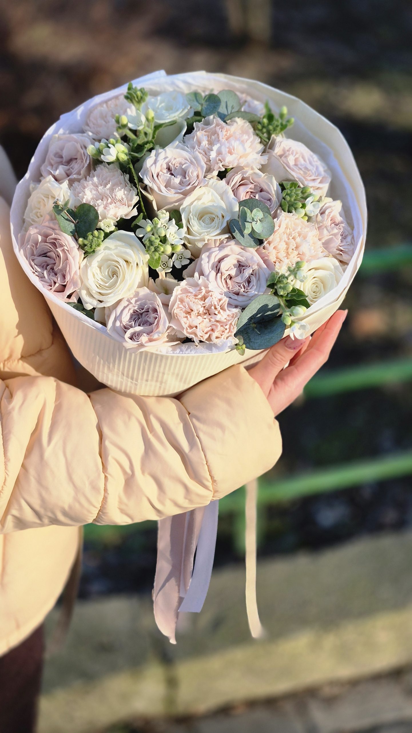 Skład bukietu: róże Premium, goździki, oxy, eukaliptus, papier dekoracyjny