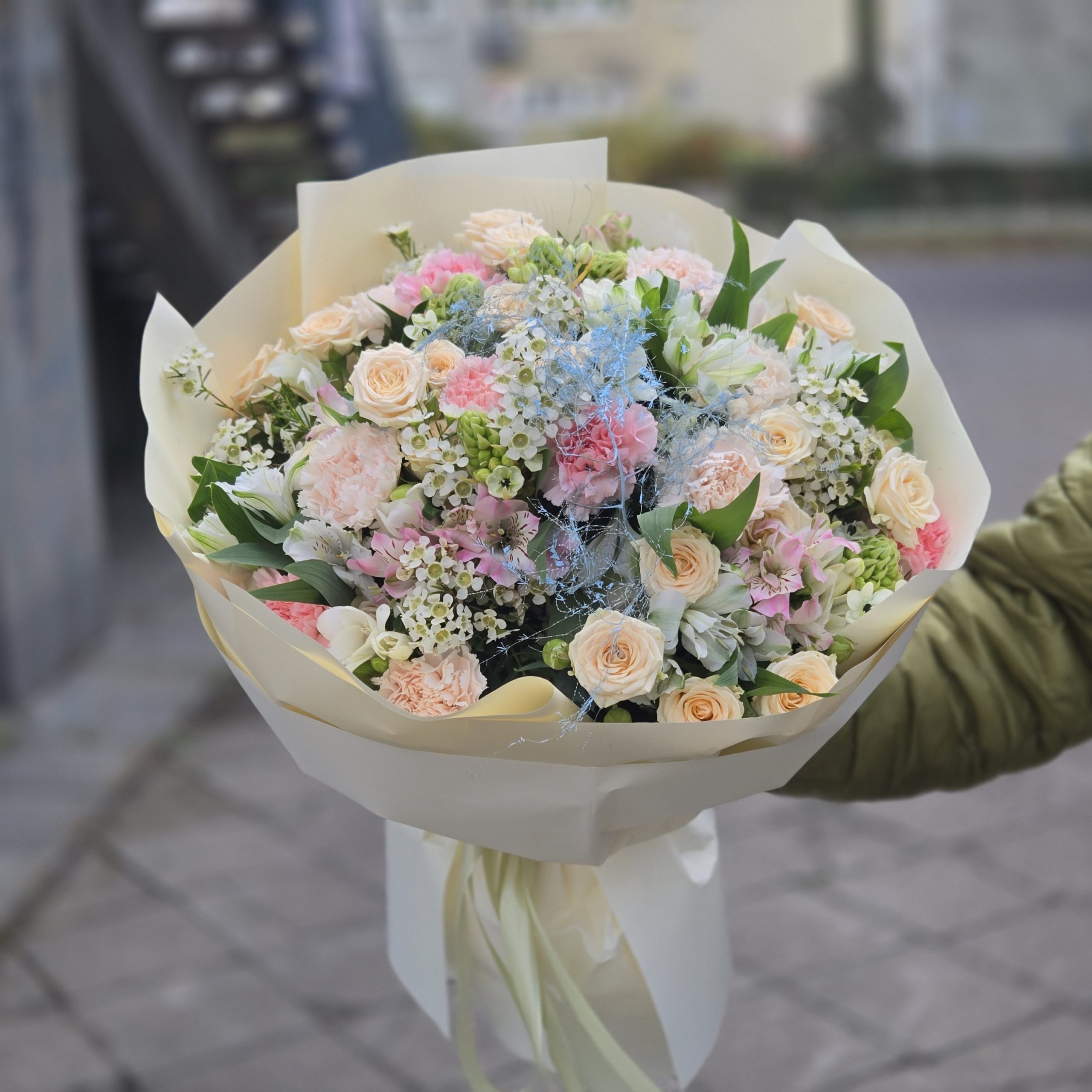 Skład bukietu: róża gałązkowa, alstromeria, goździk, wax, ornithogalum, asparagus, papier dekoracyjny
