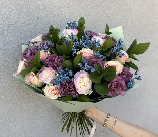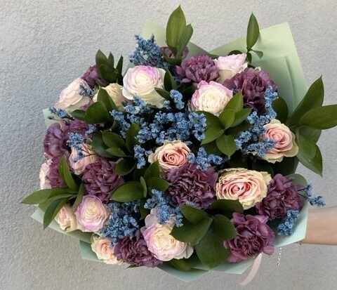 Pudrowe róże w odcieniach delikatnego różu i kremu spotykają się tu z eleganckimi goździkami w głębokim fiolecie i romantycznymi, błękitnymi akcentami kwiatów sezonowych. Całość dopełnia świeża, soczysta zieleń, która nadaje kompozycji lekkości i naturalności.