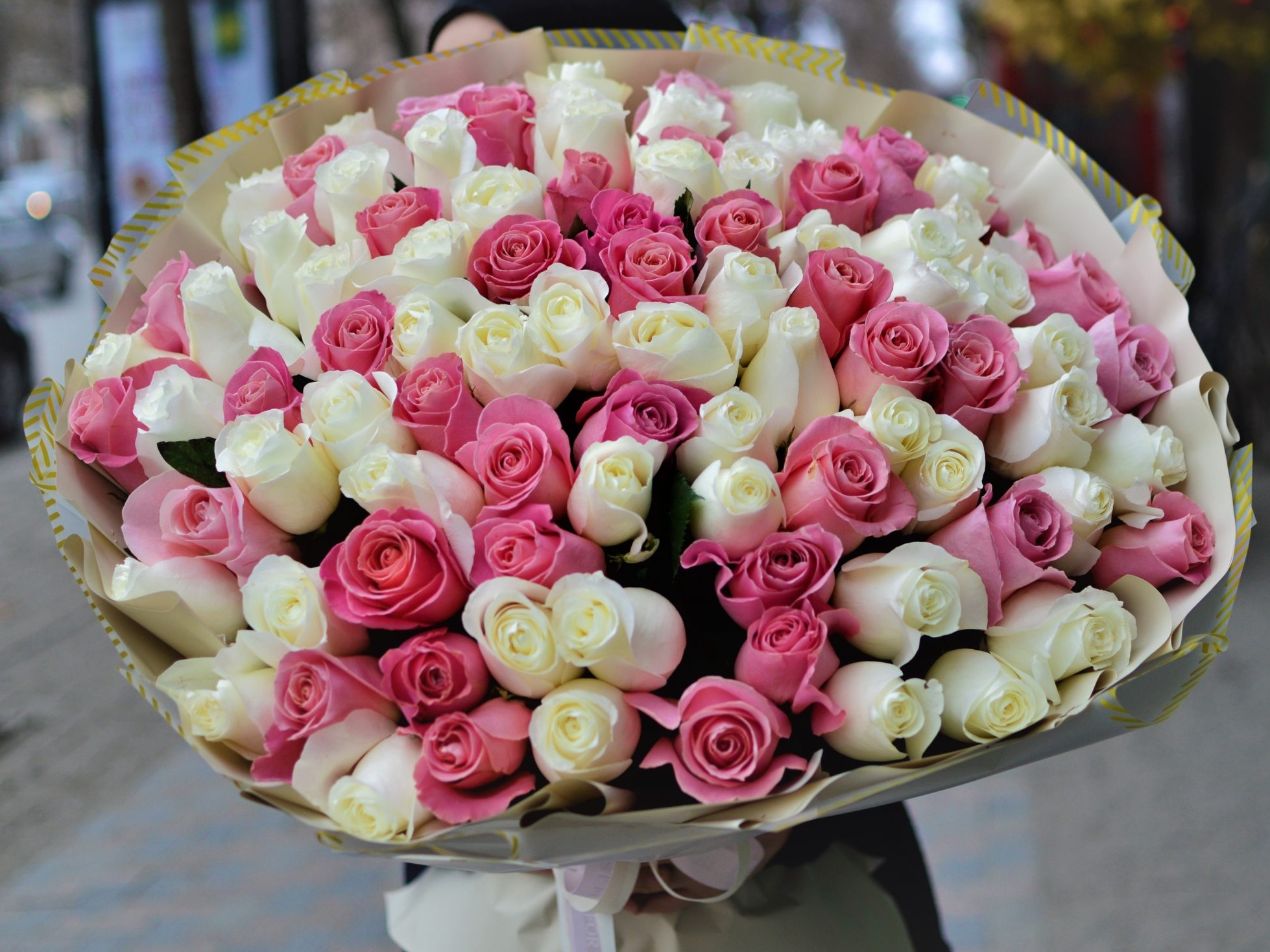 Skład bukietu: róże białe, róże różowe, papier dekoracyjny