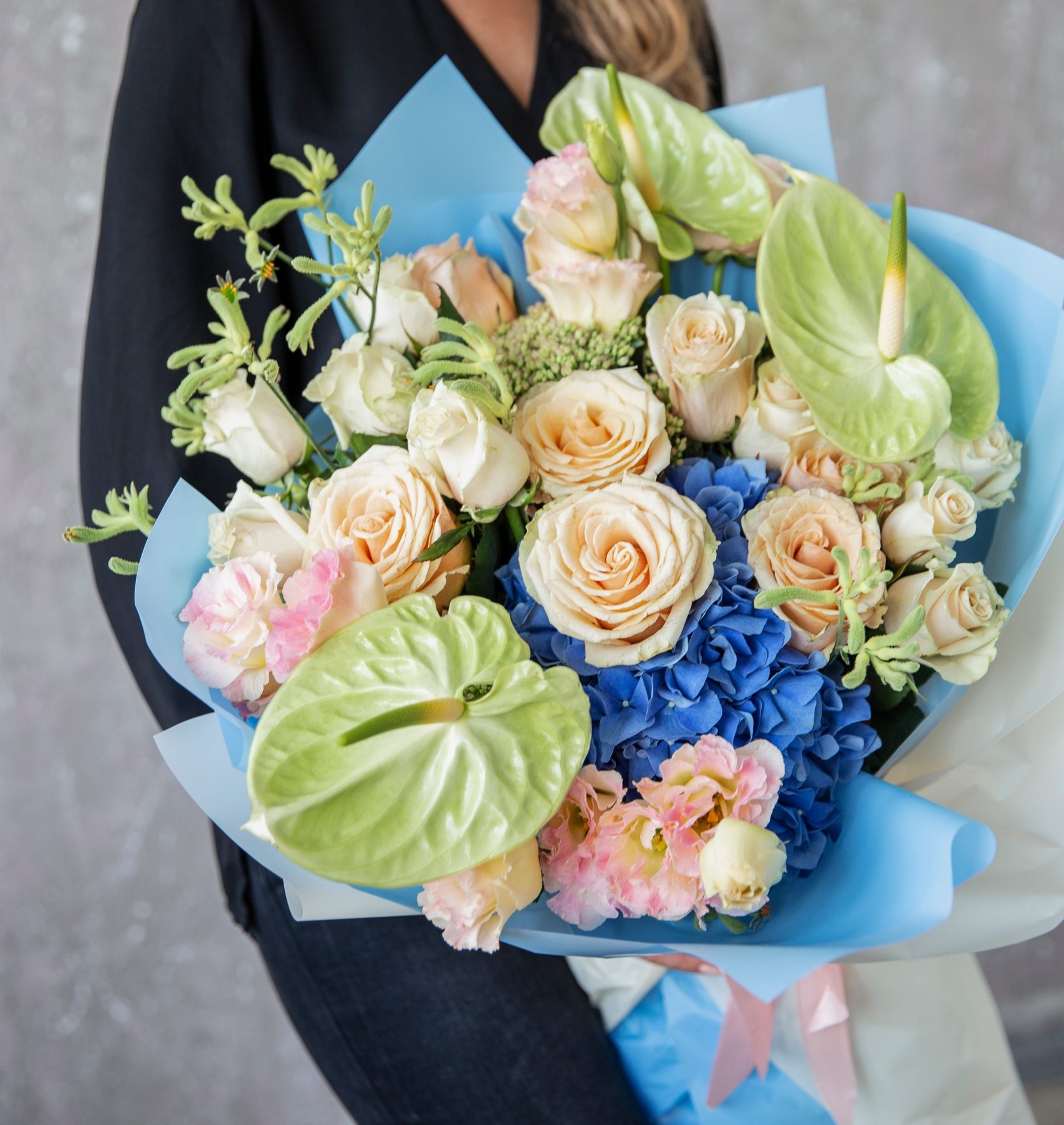 Skład bukietu: róża, eustoma, anturium, hortensja, zielone dodatki, papier dekoracyjny