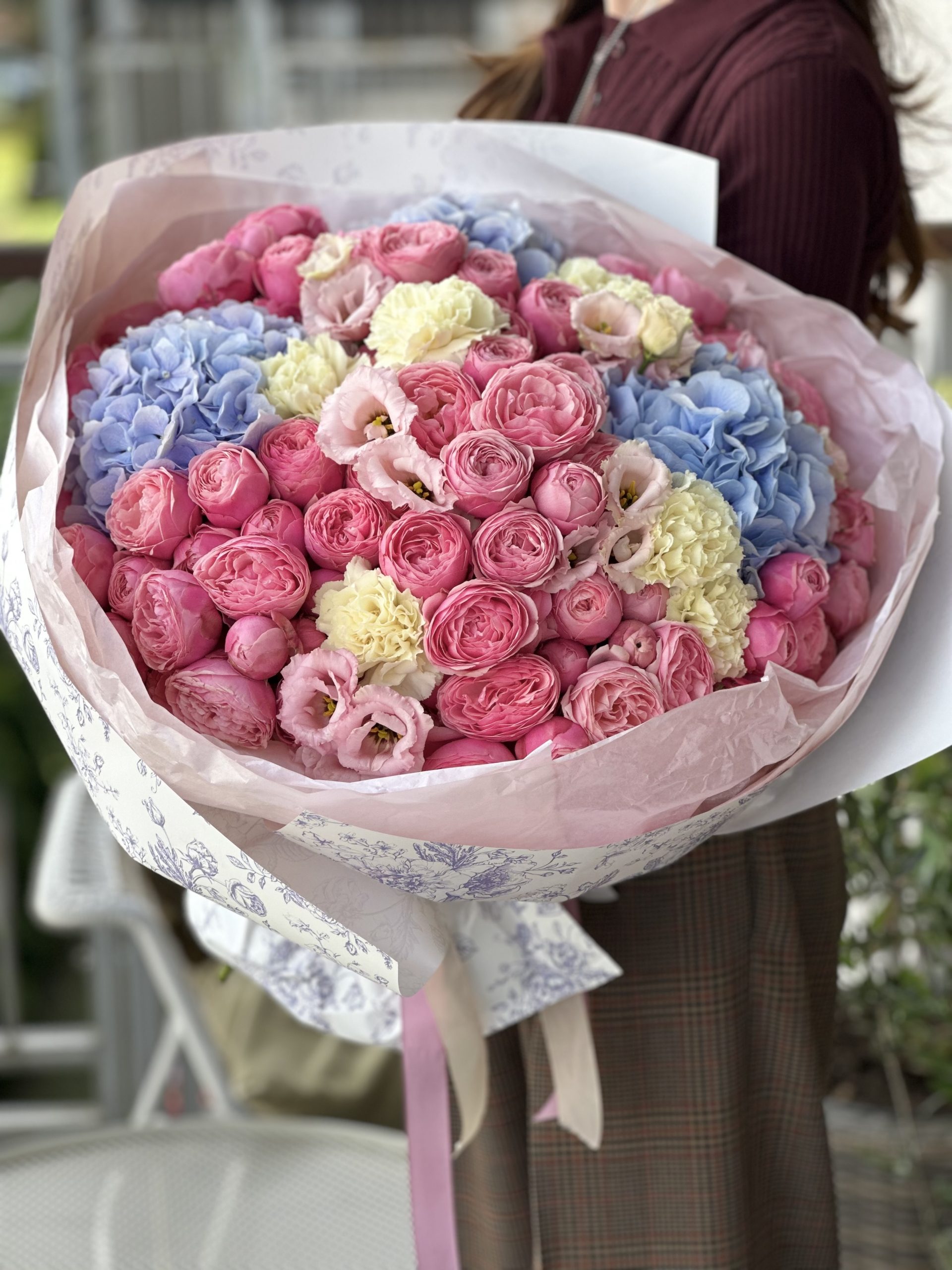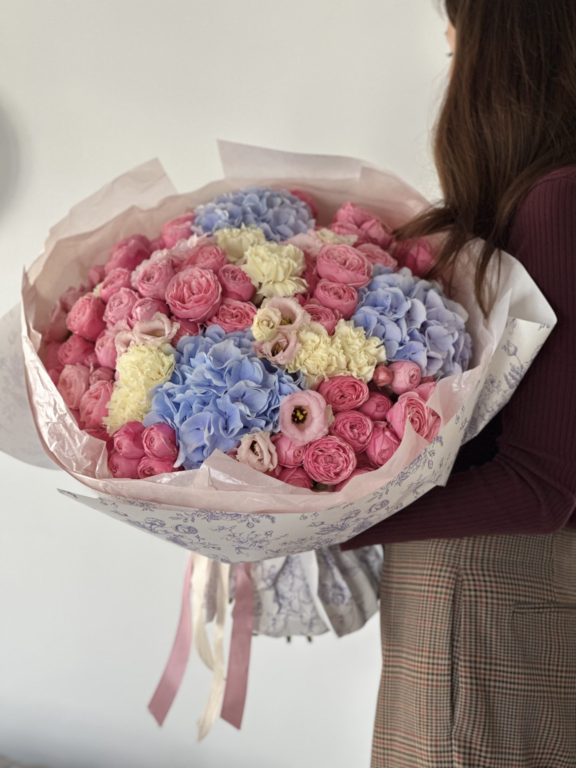 Skład bukietu: róża gałązkowa, goździki, hortensje, eustomy , papier dekoracyjny