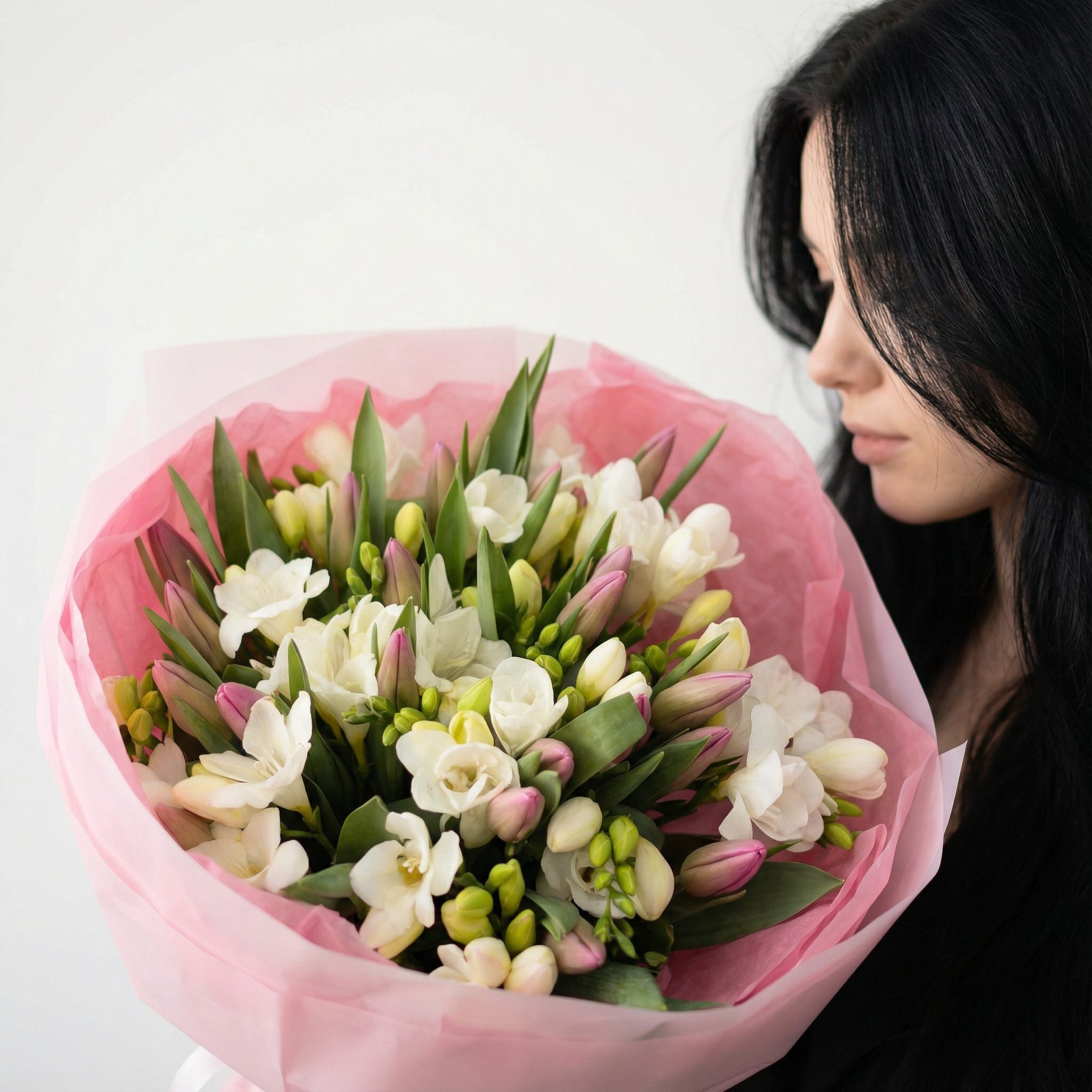 Bukiet „Pure Love” to subtelne połączenie różowych tulipanów i białej frezji.