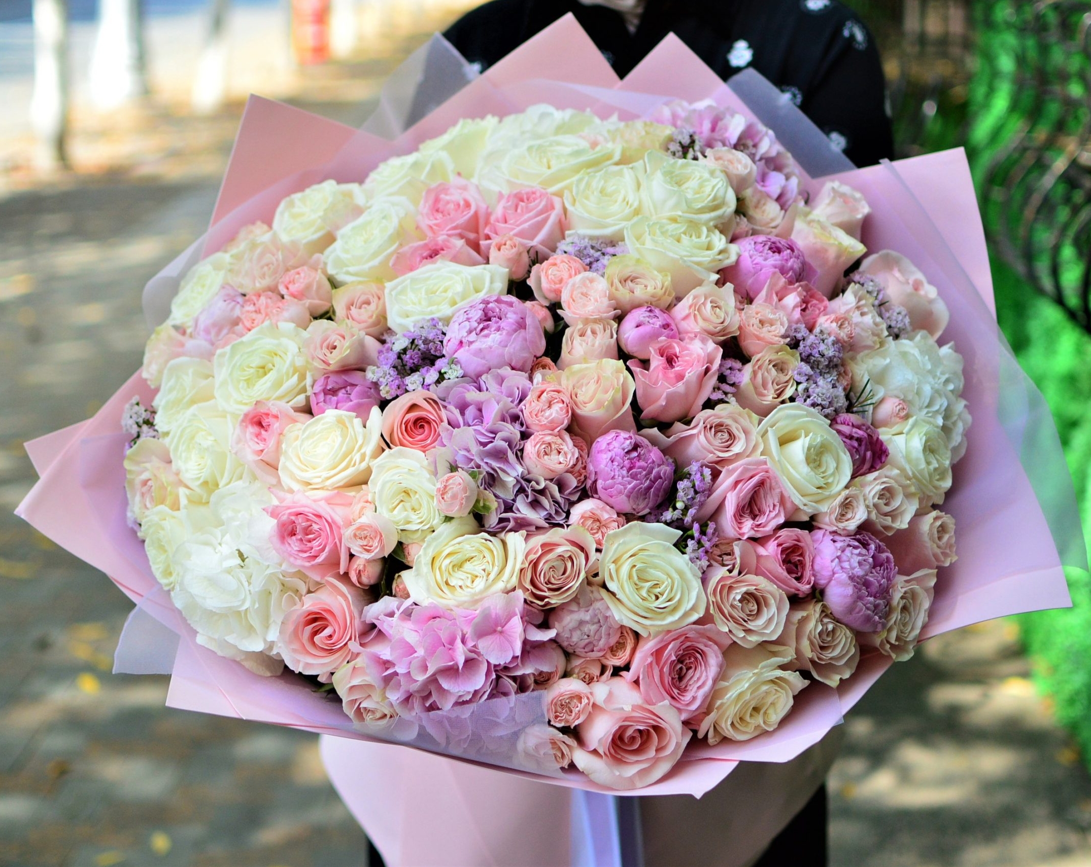 Skład bukietu: róże, róża ogrodowa, peonie, dodatki, papier dekoracyjny