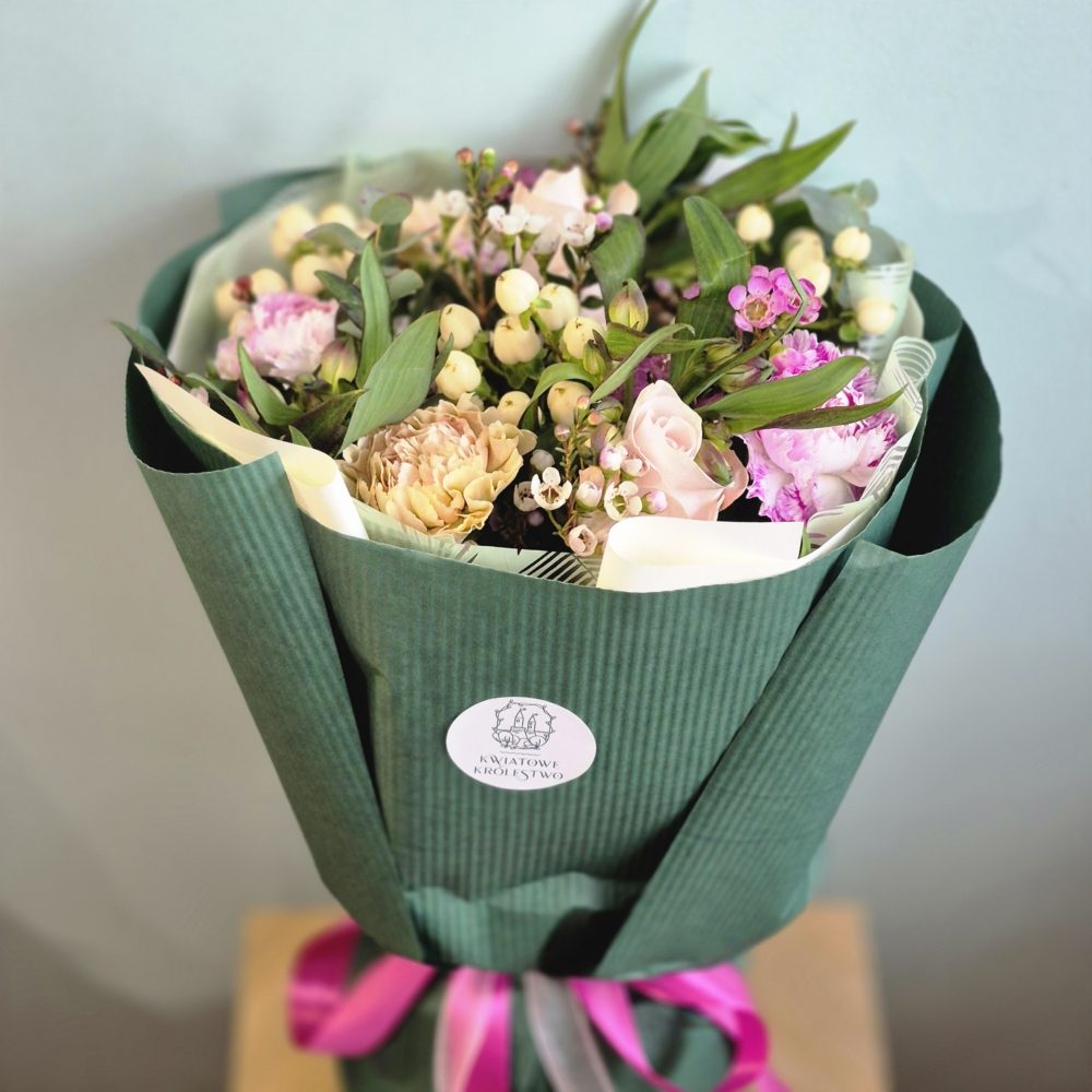 Należy pamiętać, że ze względu na sezonowość niektórych kwiatów i dodatków, bukiet może delikatnie różnić kształtem czy odcieniem kwiatów od prezentowanego na zdjęciu.