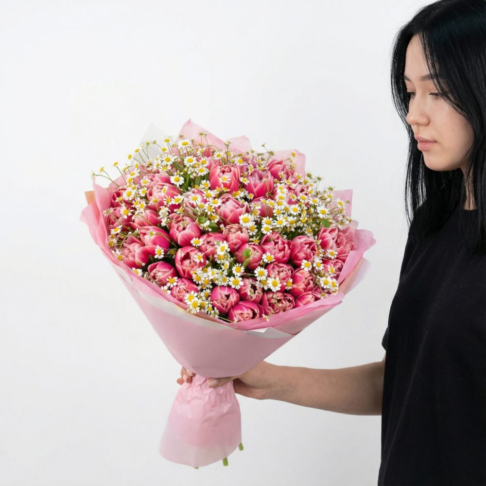 Skład bukietu: różowe tulipany, rumianek , papier dekoracyjny