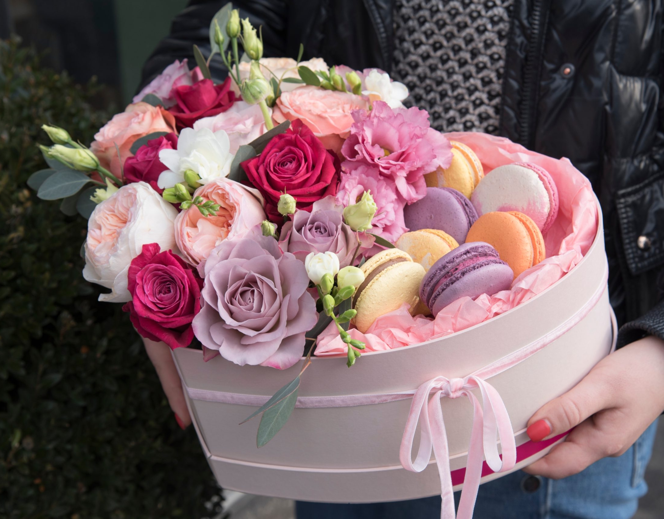 Skład bukietu: róża, róża ogrodowa, frezja, eustoma, eukaliptus, makaroniki, pudełko w kształcie serca