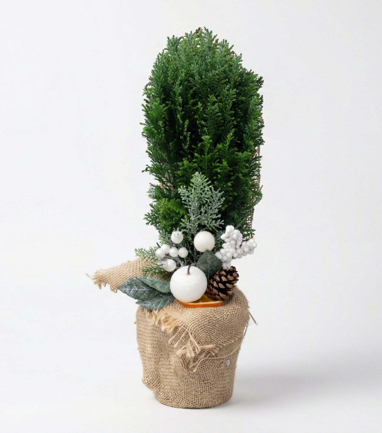 Wprowadź do swojego wnętrza nutę świątecznej magii w najpiękniejszym, naturalnym wydaniu. „Leśna Cisza” to urokliwa, miniaturowa choinka w donicy, ozdobiona subtelnymi zimowymi akcentami: pachnącą zielenią, białymi jagodami, szyszkami i dekoracjami w odcieniach śnieżnej bieli.
