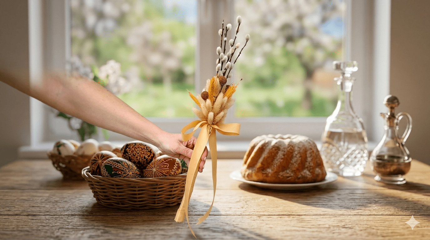 Przepiękna kompozycja w odcieniach złotej słomy. Idealne połączenie delikatnych bazi z romantycznymi kwiatami i długą, satynową wstążką. Stylowy akcent, który wniesie świeżość do każdego wnętrza.