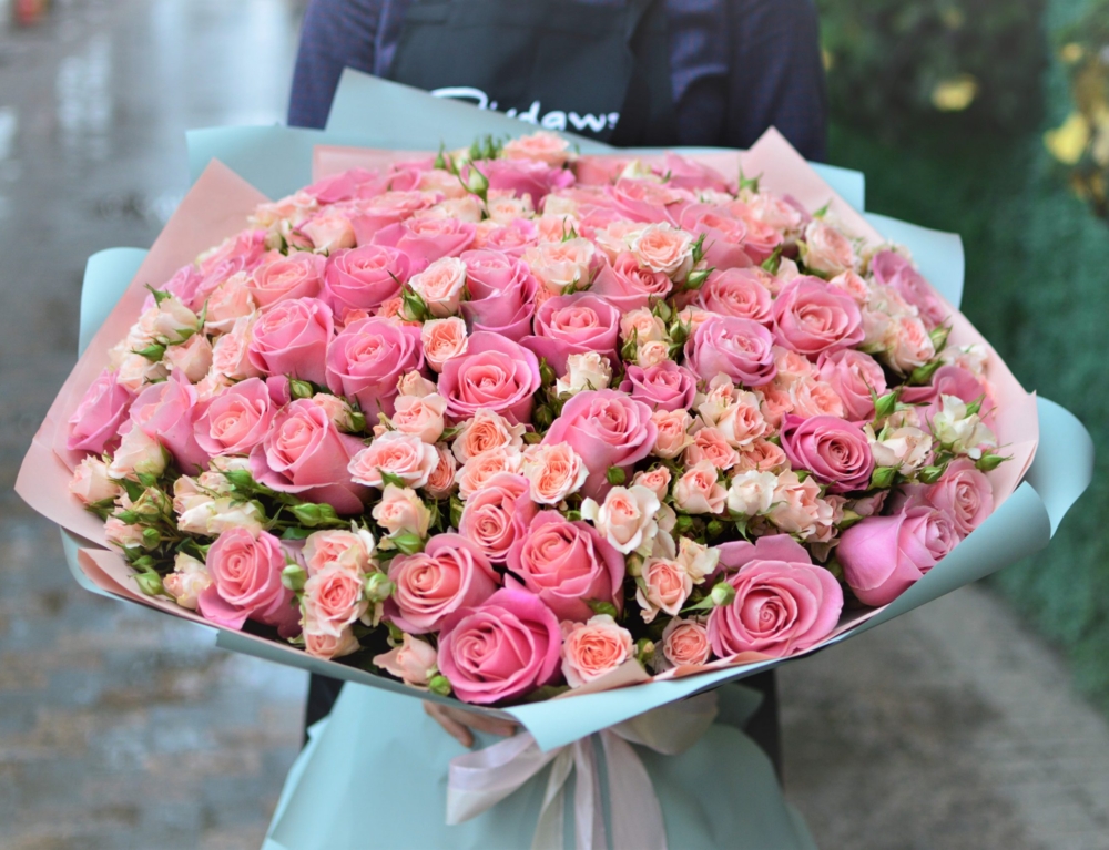 Skład bukietu: róża, róża gałązkowa, papier dekoracyjny
