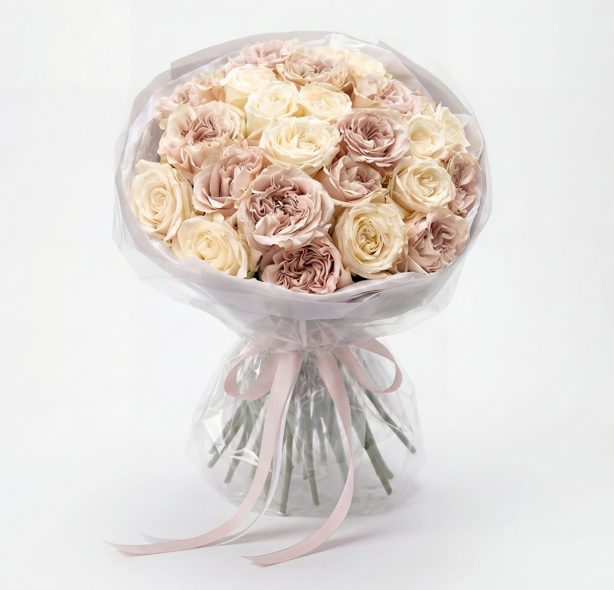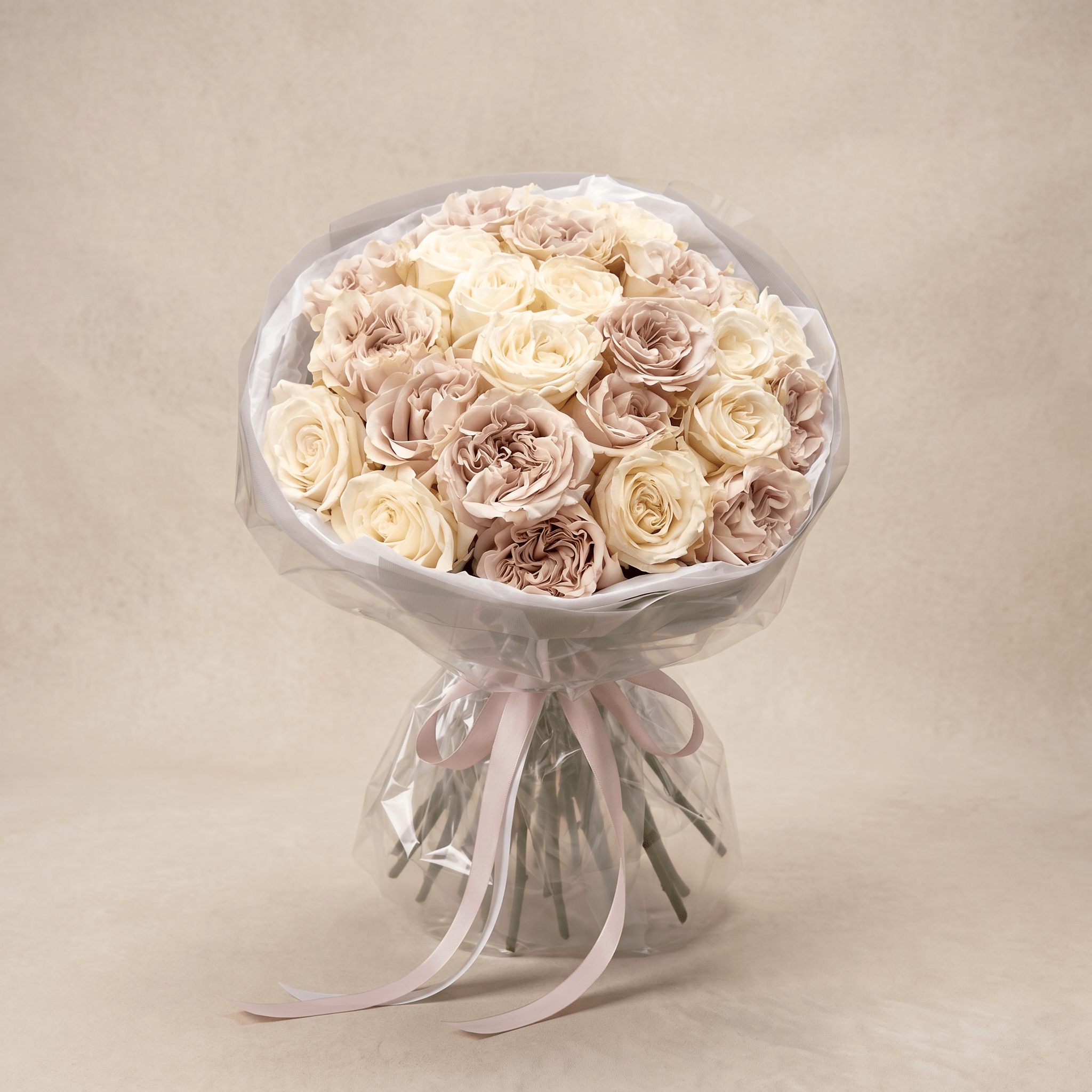 Subtelne róże w odcieniu szampańskiego beżu, delikatne, kremowe goździki i eleganckie eustomy tworzą harmonijną, luksusową kompozycję pełną klasy i wyrafinowania. To połączenie ponadczasowej elegancji z nowoczesnym minimalizmem.