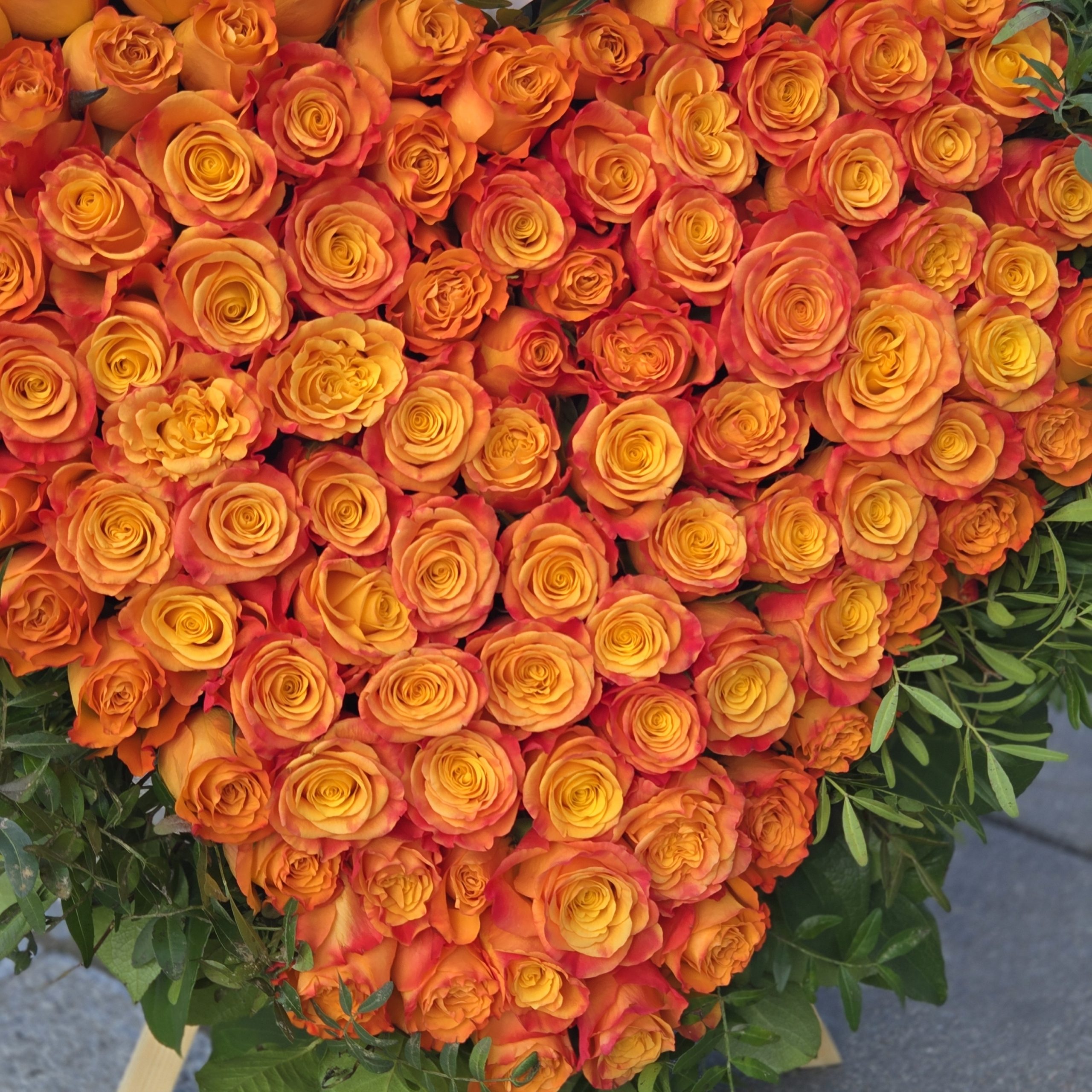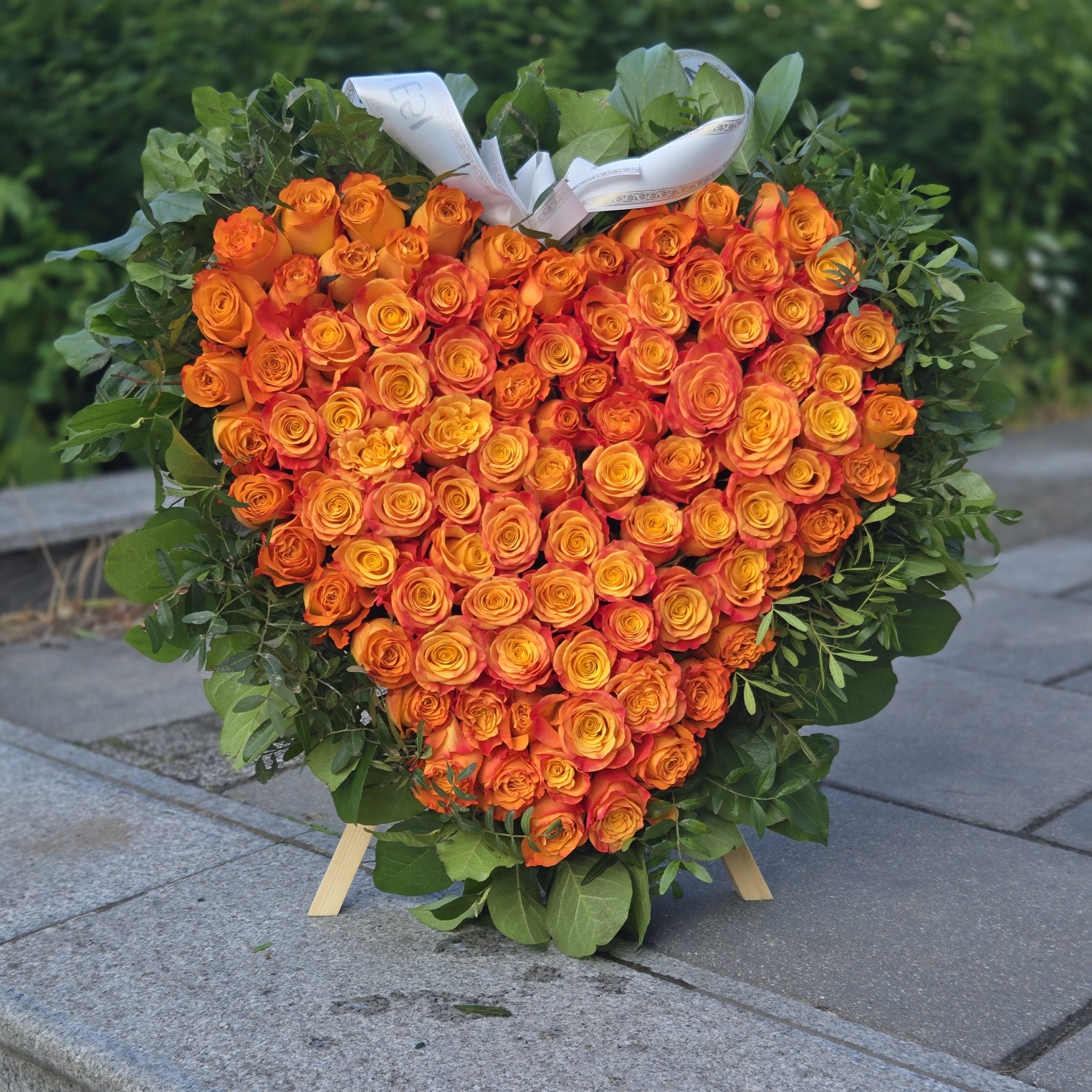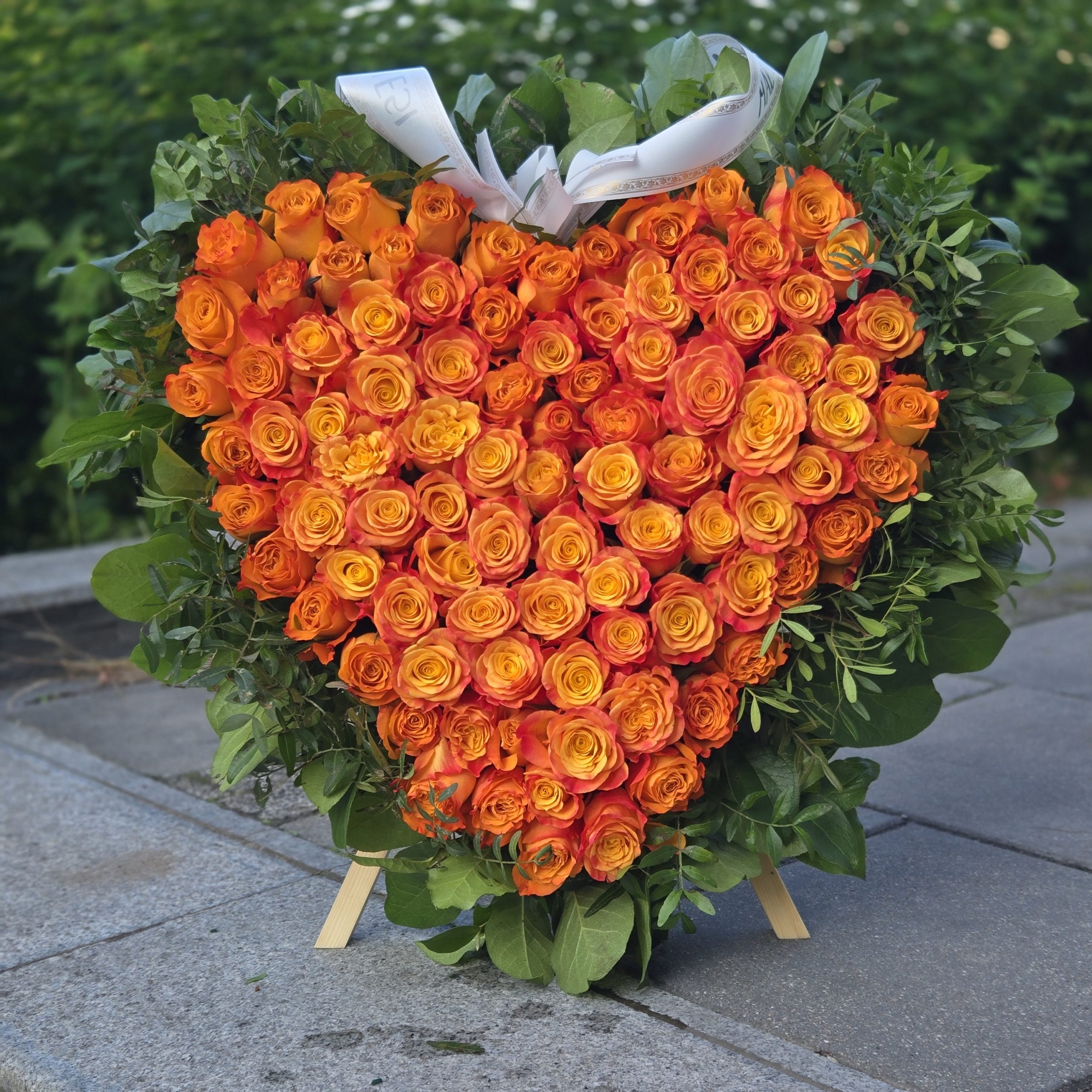 Wieniec Pomarańczowe Serce to wyjątkowa kompozycja stworzona z setek starannie wyselekcjonowanych pomarańczowych róż, ułożonych w kształcie serca. Osadzony na solidnym stojaku, stanowi wzruszający i piękny sposób na wyrażenie głębokich emocji – zarówno podczas pożegnań, jak i jako hołd dla wyjątkowej osoby.