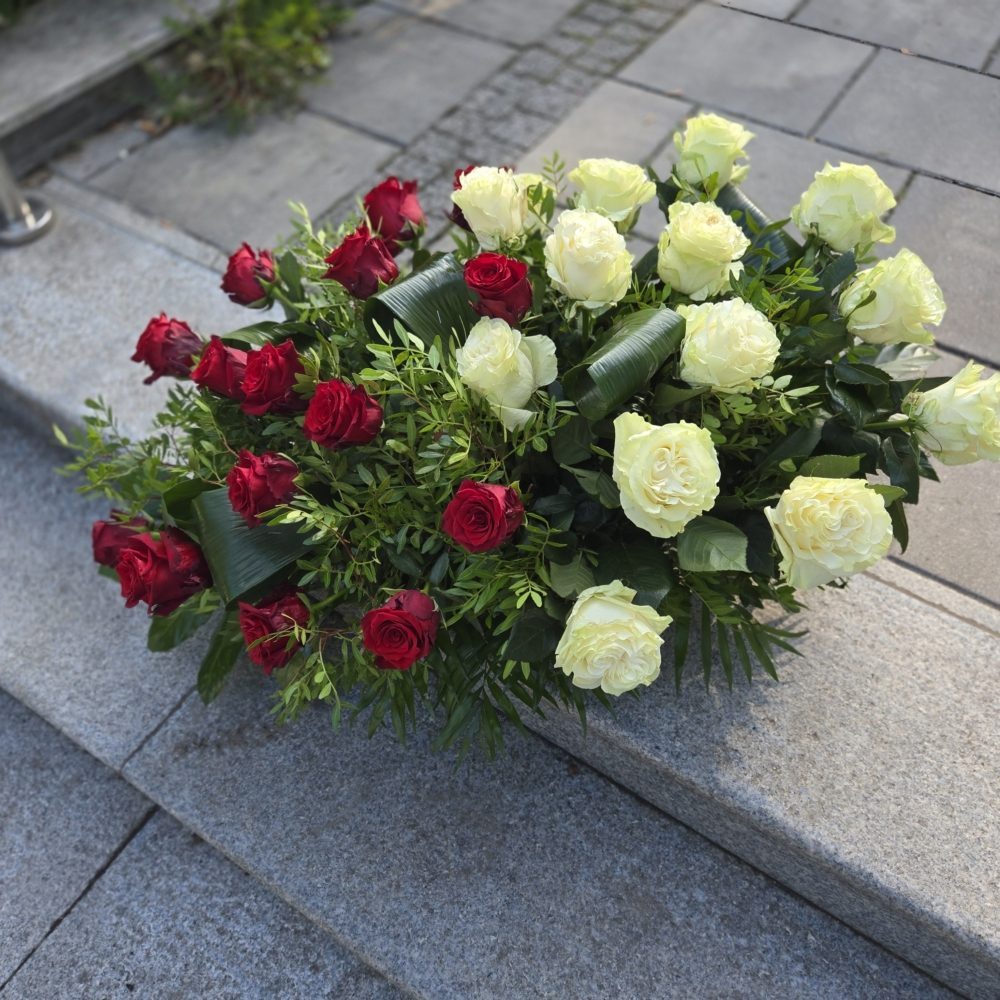 Ta forma jest idealnym wyborem, gdy chcemy wyrazić miłość i bliskość, jakie łączyły nas ze zmarłym. Czerwone róże, otoczone białymi liliami, tworzą piękny kontrast i wyjątkowo wzruszający efekt. - Kaskadowe kompozycje pionowe